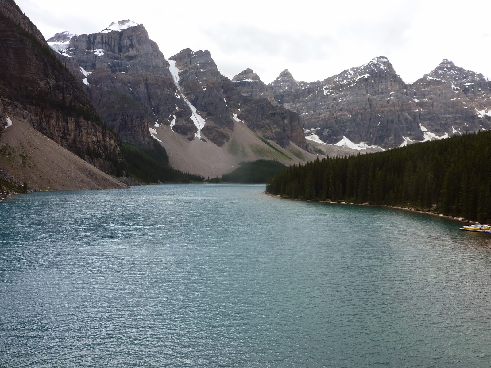 La última parada del día es en el Moraine Lake, este lago es el que estaba representado en los billetes de 5 $. La combinación de colores entre los picos de las montañas con nieve de fondo, el verde del bosque que parece meterse en el interior del lago turquesa hace de este uno de mis preferidos.